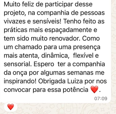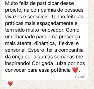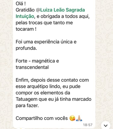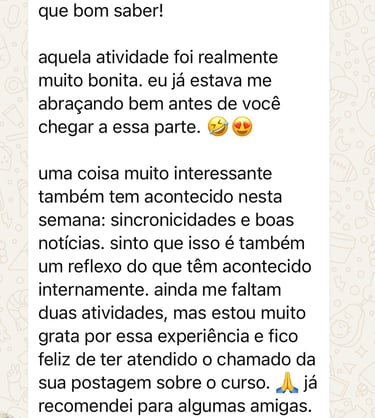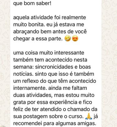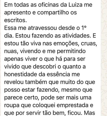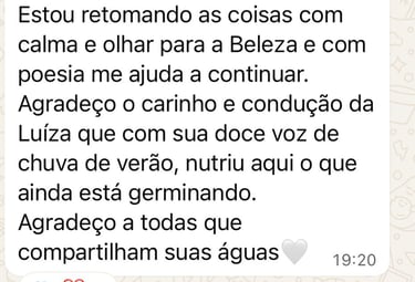 Comunidade de trocas - Desde o início do primeiro módulo, você terá acesso ao espaço aberto de partilhas em grupo de WhatsApp com o assessoramento de Luiza Leão por 6 semanas, onde além disso, poderá trocar impressões, vivências e escritas com outros participantes. Um ambiente de escuta e nutrição.
