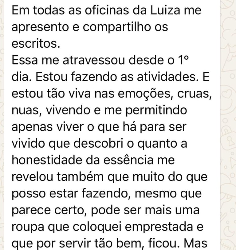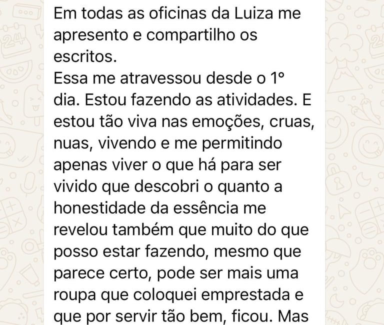 Comunidade de trocas - Desde o início do primeiro módulo, você terá acesso ao espaço aberto de partilhas em grupo de WhatsApp com o assessoramento de Luiza Leão por 6 semanas, onde além disso, poderá trocar impressões, vivências e escritas com outros participantes. Um ambiente de escuta e nutrição.